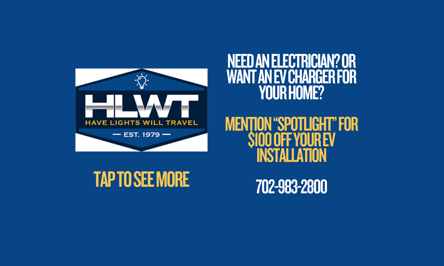 Get $100 off your EV charger installation when you mention Vegas Local Spotlight. HLWT is Las Vegas’s trusted electrical team — specializing in EV charger setups, lighting, and full-service electrical work since 1979.