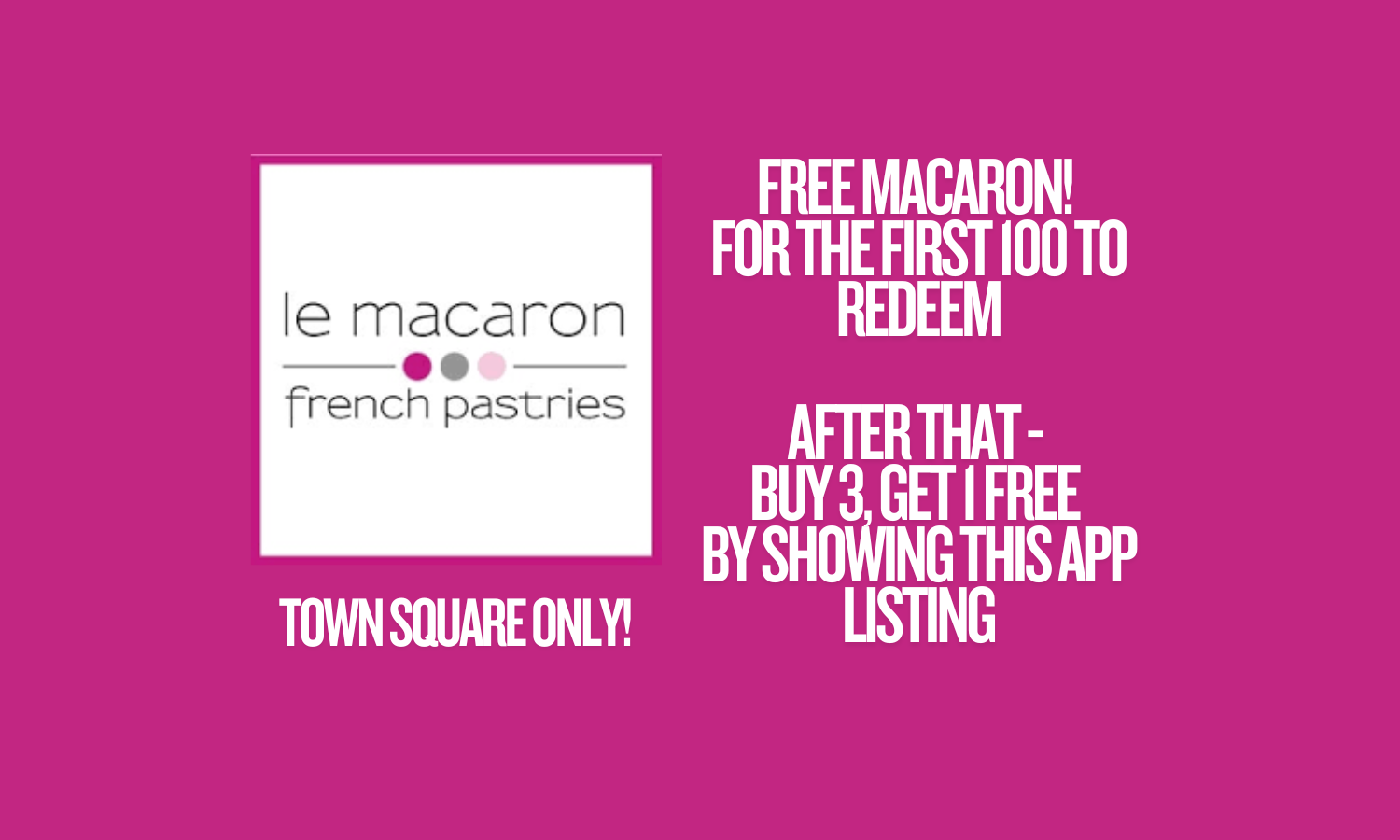 Act fast! Le Macaron in **Town Square** is giving away 100 free macarons to the first 100 people to come and show the Vegas Local Spotlight postcard. After that, you can buy 3 macarons and get 1 free by showing the postcard!